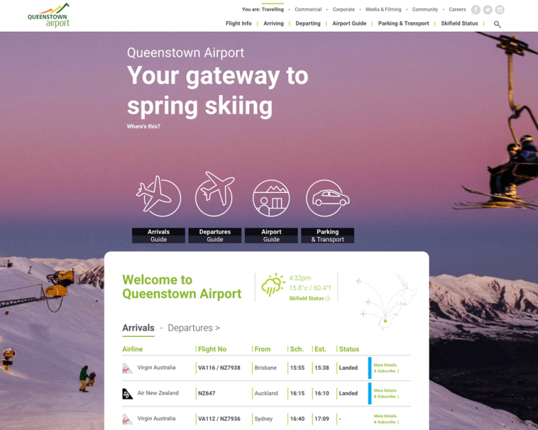 Working with Australasian web agency One Fat Sheep, I redeveloped the Queenstown Airport site, including integration of real-time flight information, flight schedules and live web cams.