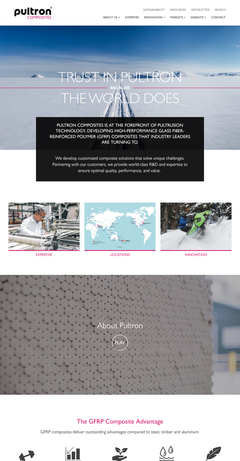 Working with Pultron's in-house marketing and Auckland agency Mechanic Group I developed this new site to represent Pultron in their global markets