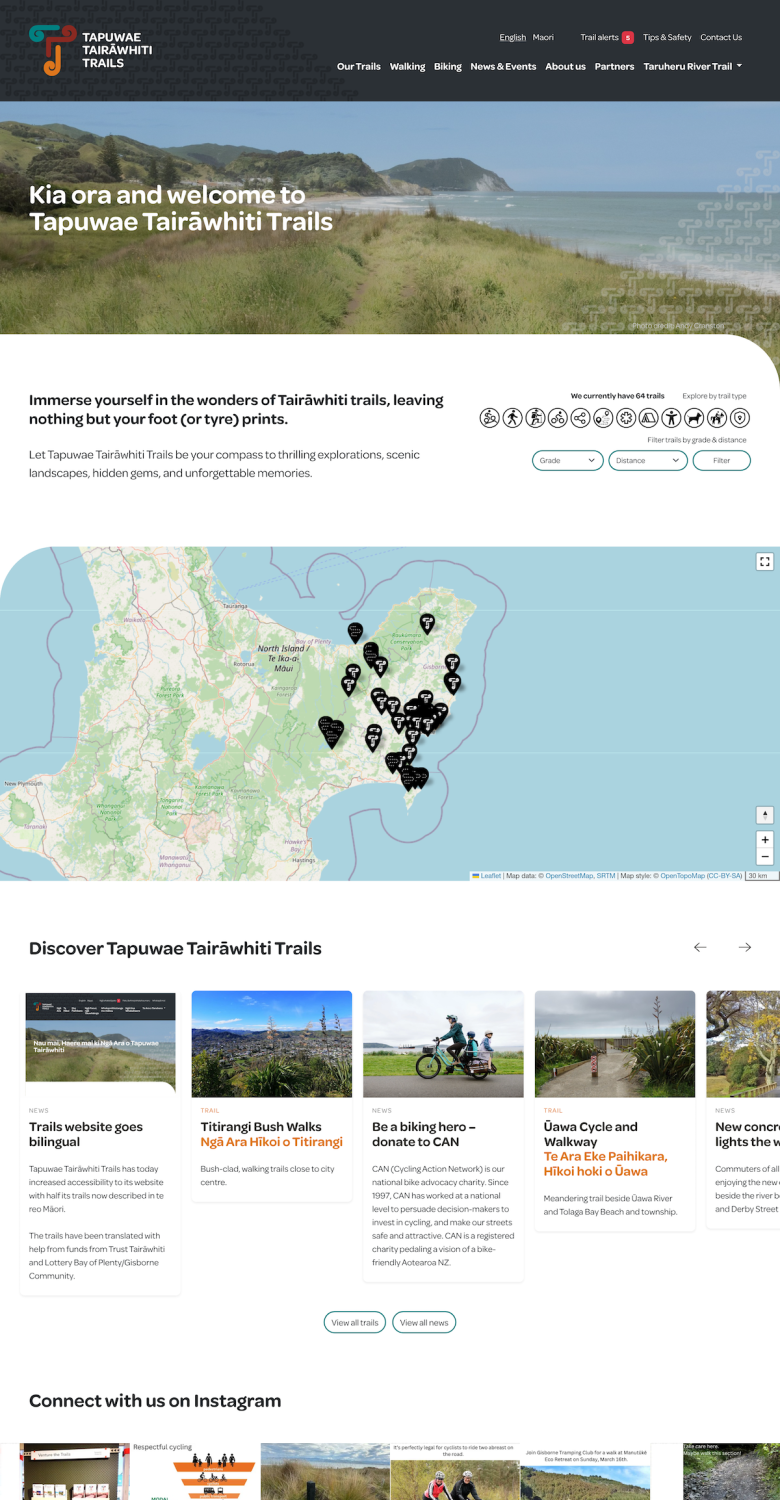 Tapuwae Tairāwhiti Trails is dedicated to creating a network of sustainable trails for cycling, walking and running in the Tairāwhiti region. Working with the Tairāwhiti Trails Trust I helped to bring this site to life, building on the brand story developed by Morley Design Group and Lardelli Arts.